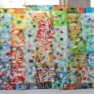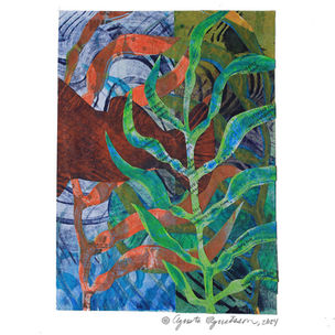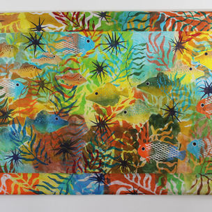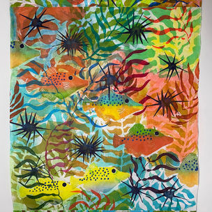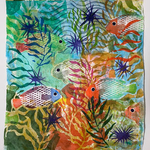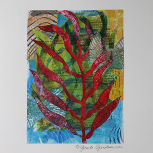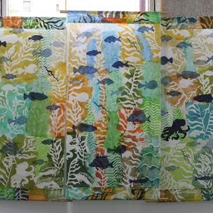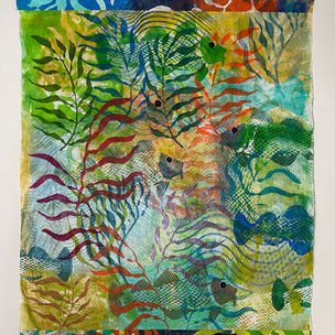 For the past two years I have been exploring creating large scale gelatin prints. The collages are created from the papers I use to clean my plate. The paper reflects the fragilty of our oceans. I create both large scale environments and smaller work of a more intimate aspect.