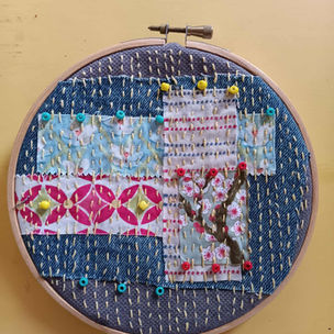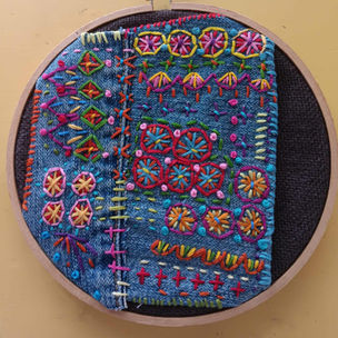 Stitching, embellishing, and marking with embroidery on fiber is my passion. I love the idea of layering color, pattern and texture on pieces of fabric. Nearly all of the fabric I work with is upcycled – old clothing, linens, upholstery samples and more. In addition to my creative practice, I love teaching classes and workshops.
