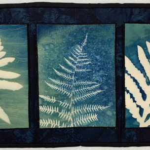 In Botanica 2, I begin with cyanotypes—sun prints made by exposing fabric treated with light-sensitive chemicals to sunlight. These prints serve as the foundation for my quilted fiber art. I enhance the cyanotypes with layers of hand and machine quilting, adding texture and dimension. Some pieces remain true to the original cyanotype, while others are digitally manipulated, transforming them into new forms before printing onto fabric and quilting.